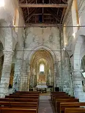 La charpente actuelle n'est, selon Marcel Aubert, pas très ancienne. Elle est dépourvue de contrefiches qui sont remplacées par de petits entraits en hauteur. L'on note l'absence de décor sculpté, tel que des engoulants. Tout l'intérieur de la nef est encore badigeonné à partir des chapiteaux des grandes arcades, conformément à l'usage qui s'est répandu au XVIIIe siècle quand l'on voulait rendre les églises le plus claires possibles. Les pierres devaient initialement être apparentes, puisque la nef est bâtie en pierre de taille, mais l'on peut pas non plus exclure un décor en faux appareil avec rehaussement des parties sculptés, ainsi que des peintures murales figurées, l'ensemble ayant dû être réalisée en ocre rouge, marron et jaune comme dans toutes les églises rurales conservant des éléments de polychromie ancienne. Le mur occidental garde des trous de boulin. Au revers du tympan, l'on observe une baie bouchée, ce qui donne à penser que le tympan devait être ajouré. Au-dessus, s'ouvre une haute baie en tiers-point à lancette simple, non décorée, puis on oculus rond destiné à éclairer les combles du temps de l'existence du plafond. La baie occidentale et les baies latérales sont largement ébrasées, mais au nord, les glacis ont été supprimés. Quant au mur oriental, il comporte à droite une baie en plein cintre bouchée, qui n'est autre que l'ancienne porte du clocher. Tout en haut, paraît une série de corbeaux qui devaient servir à la charpente médiévale. À gauche et à droite du mur oriental, paraissent les contreforts occidentaux du clocher. L'arc triomphal en tiers-point est à double rouleau et repose sur les chapiteaux de deux grosses colonnes et de quatre colonnettes (dont deux vers le carré du transept). L'intrados est moluré de deux tores encadrant un méplat, ce qui est incompatible avec l'architecture romane.