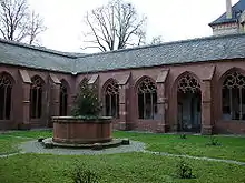 Au sud de l'église, le cloître, construit après 1462, fut achevé à la fin du XVe siècle. Une clef de voûte porte la date de 1409. Il est couvert de voûtes sur croisées d'ogives aux nombreuses ramifications et aux clefs pendantes, typiques de l'architecture rhénane du XVe siècle, posant sur de simples culots. Des combinaisons curieuses ont été trouvées pour l'agencement des voûtes de la galerie nord pénétrées par les contreforts de l'église contre laquelle elle s'appuie.
