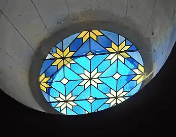 Les trois autres baies de l'église sont fermées par des vitraux identiques a décor géométrique, ainsi que l’oculus dans le bras sud du transept.