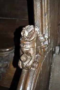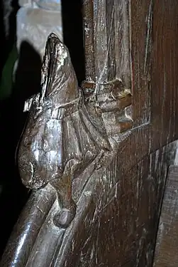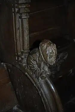 La miséricorde médiane, côté sud, est absente, un escabeau à l'usage de l'officiant en occupe la place.