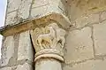 - Le premier niveau est constitué d’un portail et de deux arcades aveugles. Les chapiteaux sont classiques de cette époque : animaux, palmettes, feuilles d’eau, etc.