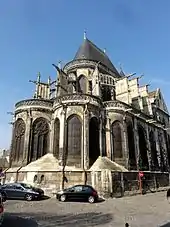 Si le chœur semble entièrement dater du XVIe siècle, il est toutefois à noter que la disposition particulière à l'extérieur du chevet, qui se trouve circonscrit par un mur en hémicycle de 2,50 m de hauteur dissimulant deux petites sacristies entre les chapelles rayonnantes, n'est connue ailleurs que dans l'architecture romane. Il semble donc s'agir d'un héritage du chœur d'origine, qui était sans doute la première partie construite conformément à l'usage qui privilégie le chœur, bien que la période romane était terminée depuis plusieurs décennies lors du début des travaux. Il peut être situé au début du XVIe siècle, et traînant en longueur, la toiture n'aurait été achevée qu'en 1584. Ce semble également être la période du remaniement de la nef et des bas-côtés, et les piliers prismatiques que l'on y rencontre également, ainsi que le réseau flamboyant de certaines fenêtres des chapelles, indiquent bien cette époque[7].