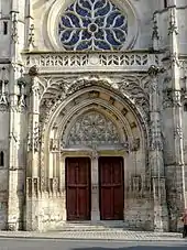 Deux tours octogonales à demi engagées dans l'avant-nef flanquent la partie centrale de la façade correspondant à la nef. Leurs contreforts peu saillants sont agrémentés d'une succession de pinacles, garnis de crochets et accueillant chacun deux niches à statues en bas. Les murs des tours sont scandés de larmiers et décorés d'arcatures trilobées plaquées, qui sont en partie surmontées d'accolades. Les toits couverts d'ardoise sont le fruit des remaniements de 1768. Entre les tours, les rampants des pignons sont garnis de crochets, et le mur est percé d'un oculus quatre-feuilles. Le pignon est placé en retrait par rapport à la partie moyenne de la façade, dotée d'une grande rosace au réseau flamboyant complexe, et cette partie elle-même est placée en retrait par rapport à la partie basse comportant le portail. Ces ressauts sont mis à profit pour l'aménagement de galeries de circulation accessibles depuis les tours, et protégés par des balustrades ajourées de soufflets et mouchettes, selon des dessins différents pour les deux niveaux. Une double frise de végétaux court en dessous de la balustrade supérieure. Quant au portail, il est cantonné de deux petits contreforts décorés de pinacles à l'instar des contreforts des tours, et son archivolte en tiers-point possède un décor sculpté particulièrement généreux, avec à l'origine huit statues trouvant leur place dans la voussure centrale. Quatre autres niches se trouvent sur les piédroits : n'en restent que les socles et les dais. Les écoinçons sont remplis de mouchettes, si bien qu'aucune partie du mur ne reste nue. Le décor du tympan renvoie au Moyen Âge et n'est pas conforme à l'époque du portail, à savoir le début du XVIe siècle : il s'agit en effet d'une création moderne. Le trumeau entre les deux portes aux vantaux Renaissance est également moderne, mais les vantaux en bois taillés sont bien authentiques. Ils sont bien conservés, sauf les statuettes en bas-relief dans leur partie supérieure : l'une représentait saint Antoine, l'autre saint Jean-Baptiste, qui bénéficiait d'un culte particulière dans l'église au XVIe siècle[16].