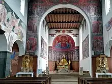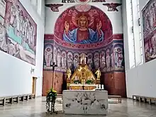 À l'intérieur, en plus de nombreuses fresques, l'immense représentation du Christ dans l'abside attire tous les regards. Cette fresque est l'œuvre de Georg Winkler, originaire de Ratisbonne, qui a conçu l'ensemble de la décoration intérieure. Le maître-autel a été réalisé par la maison Haber & Brandner; les sculptures ont été conçues par Guido Martini; les peintures sur verre ont été réalisées par deux firmes de Ratisbonne, Schwarzmeyer et Schneider. Les vitraux n'existent plus car ils ont été bombardés pendant la Seconde Guerre mondiale.