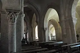 De remarquables chapiteaux sculptés ornent la nef, laquelle est voûtée en berceau brisé avec des collatéraux couverts de voûtes d'arêtes. Des poutres en bois transversales visibles sous la voûte de la nef ont été ajoutées pour conforter l'édifice.