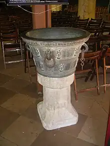 - 2 bénitiers sculptés en bronze[12] de 70 cm de diamètre en forme de vasque munis chacun de quatre anses. Le rebord est orné d'un bandeau avec inscription en saillie et au-dessous, dans des médaillons rectangulaires, des personnages en bas relief alternent avec de petites scènes finement gravées[12] ,