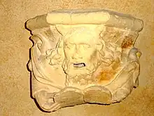 - Le cul-de-lampe Renaissance engagé dans le mur nord de la nef représentant un buste d'homme barbu et cornu, la bouche ouverte, tenant deux écussons renversés, serait également rapporté[11].