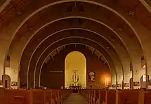 La structure de la nef est faite d'arcs en béton qui soutiennent la charpente lambrissée. La voûte du chœur est en cul-de-four.