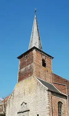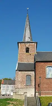 - une église de style classique construite en 1761 et consacrée en 1764 par l'évêque de Namur[1], dont il ne subsiste que le clocher ;