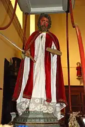 Le char porte une statue du saint en bois polychrome qui date de 1590-1599[2] et est donc plus ancienne que la statue du saint qui orne le maître-autel de l'église. Vêtu d'une aube et d'un manteau rouge orné de broderies dorées, le saint porte une bible dans la main gauche et le grand couteau qui servit à son supplice dans la main droite.