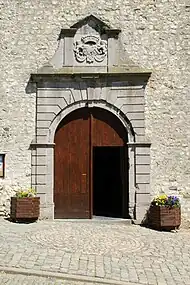 La façade occidentale de l'avant-corps est édifiée en moellons de grès[5] et est ornée d'un élégant portail de style classique.
