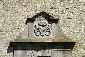 Ce portail est édifié en pierre de taille calcaire creusée de lignes de refend et est surmonté d'un entablement supportant un blason portant l'inscription "Anno 1738".