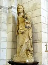 - La statue en pierre de la Vierge à l'Enfant, avec des traces de polychromie ancienne, mesure 154 cm de hauteur, et date du second quart du XIVe siècle. Elle provient de l'église de Noël-Saint-Martin, et se trouve actuellement à gauche de l'entrée du chœur (une autre Vierge à l'Enfant, non classée, se trouve dans la niche du retable au chevet du bas-côté). La tête et les mains de l'Enfant Jésus manquent. Elles avaient été maladroitement reconstituées lors d'une restauration ancienne, mais les rajouts ont été enlevés lors d'une restauration plus récente par Didier Groux. Cette œuvre est classée depuis novembre 1912[13].