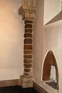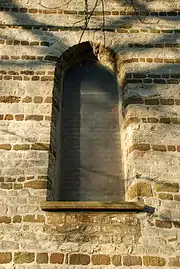 L'appareil alterné blanc et brun du chevet se prolonge partiellement sur les murs des collatéraux avant de céder la place à la maçonnerie du XXe siècle.