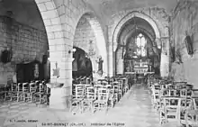 L'intérieur de l'église est assez austère. Cette dernière a fait l'objet de travaux de grande ampleur qui se sont achevés en . Une partie des lattis de la toiture et quelques charpentes étaient atteintes et ont dû être restaurées. Les matériaux utilisés pour sa réalisation semblent être pour ce qui concerne le rembourrage, du calcaire local, en outre la pierre de taille est constituée d'un calcaire plus fin ne semblant pas provenir du lieu. Pour ce qui concerne l'aspect esthétique, le clocher revêt plus la forme d'un donjon quadrangulaire fortifié de l'époque de la guerre de Cent Ans, que d'une fine et belle flèche élancée. L'ensemble de la construction, mis à part les remaniements successifs, donne l'impression d'une maison forte à l'instar des églises massives du Nord-Cotentin. Le porche ne revêt pas non plus l'aspect travaillé et richement décoré des églises romanes de la région, mais une simplicité apparenté à la rigueur protestante. L'église abrite un tableau[1] de Mme Beaufils représentant saint Jean acquis par transfert successif depuis l'église de Coux en 1842, puis Montendre en 1843 et enfin Saint-Bonnet en 1844.