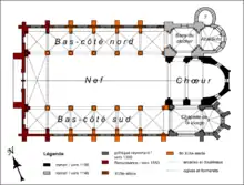 | Fin des travaux | milieu XVIe siècle (exhaussement clocher, façade et 1re travée) | ||
