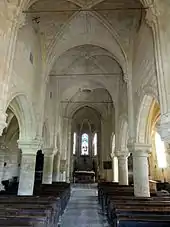 Les doubleaux et ogives retombent de chaque côté sur trois colonnettes dont les bases reposent sur les tailloirs des grosses colonnes cylindriques isolées des grandes arcades. Les trois colonnettes sont d'un diamètre identique, et elles sont toutes placées sur le même plan qui contribue à l'effet de platitude recherché dans le traitement des parois. On retrouve le même procédé à Beaumont-sur-Oise, Bréançon, Champagne-sur-Oise et Champeaux[4]. Puisque les doubleaux sont plus larges que les ogives, la partie supérieure de la corbeille de leurs chapiteaux se développe davantage en largeur. Les chapiteaux du second ordre sont sculptés de crochets et se partagent un même tailloir, dont la partie centrale incombant aux doubleaux est proéminent et plus large. Cette solution est assez originale et témoigne d'une recherche stylistique pour rendre les supports des hautes-voûtes les plus gracieux possible et les faire contraster avec le caractère solide des piliers des grandes arcades. La qualité et la plasticité de la sculpture des chapiteaux des grandes arcades, qui sont décorées de feuilles plates ou de crochets seulement ébauchés, n'est par contre pas à la hauteur. Leurs tailloirs sont carrés aux angles abattus. Aux extrémités des grandes arcades, les chapiteaux et piliers sont de dimensions réduites car ils ne reçoivent pas les colonnettes correspondant aux voûtes de la nef : celles-ci retombent ici jusqu'au sol sans interposition de chapiteaux. Quelques particularités sont à relever. La voûte de la dernière travée est percée d'un orifice pour permettre l'échange des cloches, bien que le clocher soit situé au-dessus du carré du transept. À gauche de l'arc triomphal vers la croisée du transept, un massif de maçonnerie a remplacé les trois colonnettes qui existent encore en face. Exception faite des dimensions, l'arc triomphal est sinon analogue aux grandes arcades. À l'extrémité occidentale de la nef, un renfoncement voûtée en berceau s'ouvre entre deux courtes colonnettes au-dessus du portail. Il compense la profondeur du portail et n'est pas assez profond pour servir de tribune[3].