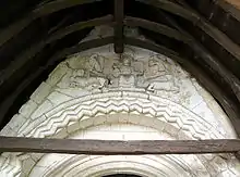 Bien que de dimensions assez modestes on distingue sur ce tympan sculpté plusieurs motifs figurés en relief :