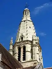 L'étage de beffroi présente huit pans, dont seulement ceux tournés vers les points cardinaux sont percées de deux baies en plein cintre géminées, et par ailleurs moins larges que les autres. À titre de comparaison, les clochers octogonaux romans de la région ont huit pans identiques, abstraction faite de la sculpture. Les ébrasements des baies sont moulurées et entourés d'un tore. Une colonnette au chapiteau corinthien stylisé est plaqué devant le trumeau, et repose sur un culot. Sur les clochers médiévaux, les colonnettes servent de supports aux archivoltes des baies ; ici, elles ne semblent pas vraiment à leur place. À mi-hauteur, un larmier scande horizontalement l'étage, en épargnant seulement les colonnettes, mais pas les ébrasements des baies, ce qui est également assez curieux. L'étage se termine par un entablement schématisé, dont l'architrave se limite à un bandeau saillant, et dont la corniche, également assez sommairement moulurée, ne comporte ni denticules, ni aucun autre motif ornemental. En revanche, la métope accueille un emblème héraldique maladroitement sculpté au milieu de chaque face, et deux têtes humaines d'allure caricaturale, ou deux chimères selon les cas, font saillie près des angles. Quant à la flèche, ses faces sont lisses, et non sculptées des écailles habituelles. Les arêtes sont garnies de crochets, seul ornement flamboyant présent sur le clocher. Sur les deux tiers inférieurs, le devers des huit pans est faible, puis la flèche se rétrécit de manière un peu abrupte, et ses pans adoptent une forme galbé. Au sommet, trône un lanternon octogonal coiffé d'une calotte, avec des fentes rectangulaires comme baies, et des colonnettes doriques plaquées devant chacun des angles. Des lucarnes aux baies rectangulaires et aux frontons triangulaires sont disposées au-dessus des baies de l'étage de beffroi. Leurs rampants sont également garnis de crochets, et ils sont sommés d'une boule[8],[10],[14].