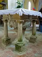 - Les fonts baptismaux, sous la forme d'une cuve baptismale à infusion placée sur un pied et cantonnée de quatre colonnettes à chapiteaux reposant sur des socles cubiques, sont en pierre calcaire. Ils mesurent 96 cm de largeur, 77 cm de profondeur et 107 cm de hauteur, et datent du XVIe siècle. À sa bordure, et sur environ le tiers supérieur de sa hauteur, la cuve est de plan rectangulaire, et décorée de moulures, puis elle transite vers un plan ovale. Une tête est sculptée en bas-relief au milieu de chaque côté de la bordure. Chaque tête montre une expression différente, joie, tristesse…, mais plusieurs ont été martelées à la Révolution. Des tentures sont accrochées aux têtes, une sous le menton et une de chaque côté. Ces tentures retombent sur la cuve, et l'enveloppent en partie, tout en se superposant aux grands godrons dont est sculptée la cuve. C'est un effet en trompe-l'œil habile, qui suggère que les tentures soient en textile, et est renforcé par leur couleur bleu clair. Chaque tête est ainsi reliée à son voisin par deux tentures. Cette circonstance ne saute pas aux yeux en raison des quatre colonnettes avec leurs tailloirs carrés et chapiteaux, qui sont tous très dégradés, mais évoquent des pastiches du gothique plutôt que la Renaissance. Le pied central, en forme de balustre et fortement galbée, est plus conventionnel. Des fonts semblables sont recensés dans la Somme, à Fescamps, Laucourt, Montdidier, ainsi qu'à Laboissière-en-Thelle. Les fonts baptismaux, en mauvais état, sont classés depuis novembre 1912[16].
