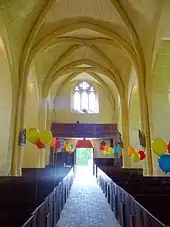 La nef est pratiquement aveugle, car les grandes arcades montent presque jusqu'au sommet des murs. Elle n'est éclairée directement que par la baie occidentale, qui constitue sans doute le détail architectural le plus intéressant de la nef. Elle est munie d'un remplage rayonnant de trois lancettes, dont celle du centre est moins aigüe que les deux autres, et surmontée d'un oculus inscrivant un quatre-feuilles. Chaque lancette inscrit une tête trilobée, qui, dans le cas des deux lancettes aigües, est surmontée d'un trilobe. Les meneaux affectent une modénature chanfreinée et ne portent pas de chapiteaux, ni de bases, ce qui indique la période rayonnante tardive. Le dessin des réseaux semblé dérivé des baies du transept et de l'abside de Chambly, où l'on trouve un octolobe à la place du quadrilobe, et des quadrilobes à la place des trilobes, étant donné les dimensions plus considérables de cet édifice. Les proportions de la nef sont trapues. La hauteur des piliers au niveau de la retombée des voûtes ne dépasse pas la largeur du vaisseau. La hauteur totale sous le sommet des voûtes équivaut à une fois et demi la largeur. Ces proportions manquant d'élancement sont fréquentes à la période flamboyante, mais elles sont en l'occurrence les mêmes dans les parties orientales. Avant son voûtement, la nef devait donc être plus élevée que le chœur, car l'espace compris entre la charpente en carène renversée était certainement rattachée à l'espace intérieur[12].