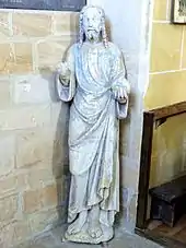 - La statue du Christ Sauveur est en pierre calcaire, avec des traces d'une polychromie ancienne. Elle mesure 165 cm de hauteur, et date du XVIe siècle. Jésus est représenté debout, les cheveux bouclés, vêtu d'une longue chemise, les pieds nus, tenant un globe dans la main gauche et bénissant de la main droite. Cette statue, d'une iconographie peu commune, est classée depuis juillet 2006 seulement[19].