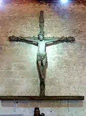 - Le Christ en croix, en bois polychrome, mesure 180 cm de hauteur et autant de largeur, et porte les caractéristiques des alentours de 1500. Le crucifix est assemblé de deux minces troncs d'arbre écotés, et prend encore appui sur une poutre assez fine, décorée seulement de moulures. Près de ses quatre extrémités, il porte des petits médaillons, sur lesquels étaient peints les symboles du Tétramorphe. Ils seraient rapportés. Le Christ est assemblé de plusieurs morceaux, et d'une allure très raide. La frontalité de la représentation évoque encore la création du XVe siècle, et le rendu approximatif, très stylisé, de l'anatomie, traduit une œuvre d'art populaire. La tête notamment, inclinée légèrement vers la droite, et la couronne d'épines, sont sculptées d'une main lourde. Le drapé du perizonium court, noué sur son flanc gauche, est un peu mieux réussi. Ce Christ en croix est classé depuis juin 1925[13].