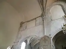 La voûte de la première travée n'a pas été réalisée, mais des amorces de nervures prouvent qu'une voûte était bien prévue. Finalement, l'on a recouvert cette travée d'une fausse voûte en berceau, semblable à celle de la nef, mais plus élevée. Elle est cependant située à un niveau trop bas pour permettre le plein développement des fenêtres : seule leur partie inférieure reste visible depuis l'intérieur du chœur. À la limite entre la première travée et la nef, les supports sont de style Renaissance et mettent en scène une superposition de pilastres ionique et corinthiens, avec des chapiteaux surmontées d'une section d'entablement complet. À la limite entre la seconde et la première travée, des autels orientés sont placés devant les piliers, et vers le vaisseau central, ceux-ci ont reçu une décoration spécifique afin de fournir un cadre pompeux aux statues qui y sont accrochées. Au nord, les supports du premier ordre ont été supprimés au profit du fronton triangulaire, mais au sud, l'on aperçoit encore un groupe de chapiteaux flamboyants dont la sculpture n'a pas été exécutée. En effet, ce sont des piliers ondulés dans le goût flamboyant qui séparent la deuxième de la troisième travée. Leurs ondulations rappellent un faisceau d'une colonne et de deux colonnettes, et les chapiteaux du second ordre reflètent cette structuration. Ils sont toutefois ioniques, et donc de style Renaissance. Cette disposition est assez originale : non seulement les piliers ondulés ne sont habituellement pas associés à des chapiteaux Renaissance, mais en plus, la Renaissance privilégie des colonnes ou pilastres uniques avec des chapiteaux uniques.
