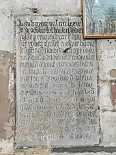 Parmi les inscriptions et plaques de fondation qui ont subsisté à ce jour, deux sont classées au titre objet. L'une date de 1545 et rappelle une fondation faite par Jean Dufour et Jean de Maricourt. Au sommet, l'on voit une Pietà entre deux blasons. Tout le reste de la plaque est couverte de la longue inscription : « L'œuvre et fabrique de l'église de ceans est / tenue et obligée de faire dire et celebrer a tour / jours pour chacune cedmaine l'an au jour du / vendredi un basse messe des cinq plaies... Etsonner... (par) la grosse cloche et... Pour Dieu des / ... Et à lafin deladite messe dire le de Profundis / et oraisons sur la (tombe) de mr Jehan du four et à tout / ... La dite fabrique est obligée a savoir dire un obit solennel/avec douze basse messe le IIe jour de juin sonner de toute / les cloches et doibtdite... Ornemens et... / ... Messe pour le salut de l'âme feu jehan Dufour en son/vivant pretre receveur et p... De Cerifontaine par / noble homme messire Jehan de Maricourt chevalier baron/de Mouy et.. ; dudit Cerifontaines et par ces... Tant / vivants que trespasses le quel du... Et de ladite messe et obit... / ladite fabrique sept quartiers de pre à prendre a la/prairie dudit cerifontaines et troys arpents et deux : de terre à prendre au Val de Mar... A charges de / eulx comme elle... / ... Par le notaire dudit Cerifontaines / ... Et fut tué / ledit Dufour au château dudit Cerifontaines par le s... De... Souls la conduite du capitain de la... / le Prince.... Priez Dieu pour eulx »[12]. L'autre inscription est relative à la consécration de l'église. Son texte est le suivant : « L'an de grâce Mil CCCC LXXIX le XVIIIe jour de octobre fut benite et dedie ceste / eglise p[ar] réverend père e[t] Dieu mai/stre Robert Clement evesque [...] / suffragant soulz reverend père et Dieu messire Guillaume (?) de Touteville cardinal et/archevêque de Rouen et donat [...] suffra / gant souls sa puissance et [...] / [...] jour de pardon et [...] dudit [...]messes / [...] »[13].