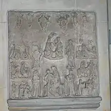 - Un bas-relief en pierre orné de scènes de la vie de la Vierge, datant du XVIe siècle, fait l’objet d’un classement au titre objet des monuments historiques depuis le [15].