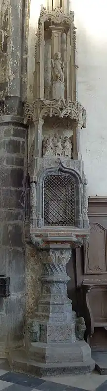 - Théothèque, c’est-à-dire un tabernacle monumental en pierre. Cette théothèque, datant de 1520 était jadis polychromée ; elle a conservé quelques indications colorées et présente des bas-reliefs évoquant des scènes religieuses. Elle est dominée par une tourelle néo-gothique de la fin du XIXe siècle.