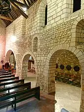 Également très ancienne, romane ou gothique, est la grande arcade bouchée dans la partie gauche (nord) du mur oriental. La partie droite de l'arcade est moulurée d'un tore et d'une gorge, et les piédroits sont flanqués d'une colonnette appareillée avec base moulurée. Les chapiteaux et leurs tailloirs ont été remplacés par des blocs non taillés. Si le plan fourni par Bernard Duhamel est juste, la travée fut pendant un certain temps subdivisée en deux travées par une arcade intermédiaire ou deux contreforts internes. C'est sans doute dans le contexte de ce remaniement, destiné à consolider le clocher, que la partie gauche de l'arcade a été supprimée, et remplacée par un rang de claveaux au tracé surbaissé. Mais à l'arrière-plan, la trace de l'ancienne arcade demeure néanmoins visible. Cette arcade fournit une indication précieuse sur l'architecture du chœur de la seconde moitié du XIIe siècle, qui devait donc s'accompagner d'une chapelle latérale au sud, et se prévaloir d'une architecture plus ambitieuse que l'édifice actuel, sans doute endommagé sous la guerre de Cent Ans ou les guerres de religion. Seules des fouilles seraient susceptibles d'apporter davantage d'indications. Assez curieusement, l'arcade ouvrant sur le chœur est fruste. Son tracé en tiers-point donne à penser qu'elle a été reprise ultérieurement. Il est également intéressant de noter que la base du clocher n'a jamais été subdivisée en deux étages par un plancher intermédiaire. En tout cas, aucune trace n'indique l'existence ancienne d'un tel plafond, et s'il y en avait eu, la baie occidentale située en hauteur n'aurait éclairée que l'étage. C'est donc depuis la construction du clocher que deux baies superposées font entrer le jour du côté sud. Apparemment modernes sont la porte à droite (sud) du mur oriental, et l'arcade vers le bas-côté à droite (nord) du mur occidental.