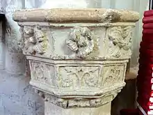 Également au domaine de la sculpture appartient le bénitier face au portail latéral sud. Taillé dans un bloc de pierre calcaire, et placé sur un fût octogonal, il mesure 91 cm de hauteur (avec le pied), 41 cm de largeur et autant de profondeur. Le décor en bas-relief de la cuve octogonale permet une datation du début de la Renaissance. La moitié supérieure de chacune des faces est sculptée d'une rose, et la partie inférieure comporte un panneau affichant une composition végétale, deux anges présentant un blason, deux dragons s'affrontant, deux aigles autour d'une fleur, et le pélican nourrissant son petit de sa propre chair, symbole de l'Eucharistie. Un tore court à la bordure, des baguettes délimitent inférieurement et supérieurement les deux registres, et une frise de feuillages se profile dans l'échine sous la cuve. L'intérieur de la cuve a reçu une doublure en majolique au XIXe siècle. Elle est aujourd'hui cassée. Une couche de peinture blanche, qui recouvre une peinture verte du XIXe siècle, altère la qualité de l'œuvre. Ce bénitier est classé au titre objet depuis [27].