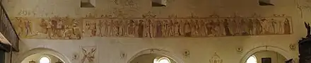 Le récitant est assis et écrit sur son parchemin. Il présente le branle en chaîne ouverte[3] dansé par les personnages et rythmé par trois squelettes musiciens. Le cortège suit, formé de 19 couples de Vivants escortés par leur mort. Cet ensemble de clercs et de laïcs représente toutes les conditions sociales. Les Vivants se détachent sur le fond blanc vêtus de costumes colorés aux harmonies d’ocres, de terres, de verts, de roses et de violets.