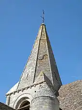 Le clocher roman ne compte qu'un unique étage, partiellement obstrué par les toitures de la nef et du chœur. Il est toutefois percé d'une baie plein cintre par face, assez large et flanquée de colonnettes garnies de chapiteaux sommaires. Dans le Vexin français, seulement le clocher de l'église Saint-Gervais-et-Saint-Protais de Saint-Gervais ne possède également qu'une unique ouverture par face. Les archivoltes ne sont pas décorées, mais les contreforts d'angle sont arrondis pour suggérer des colonnettes engagées, et un cordon en dents de scie (partiellement cassé) fait le tour de l'étage à hauteur des impostes. Un cordon identique est visible en dessous des fenêtres, au nord et au sud. Les murs sont couronnés par des corniches de corbeaux sculptés en masques. Les faces de la pyramide sont décorés en écaille de poisson, et délimitées par des tores le long des angles. La transition du plan carré au plan octogonal se fait par de simples plans inclinés, habituellement remplacés par des clochetons. Quant à la base du clocher, elle est constituée de quatre énormes piliers reliés entre eux par des arcades plein cintre. La voûte d'arêtes n'est plus d'origine et est perforée d'un trou de cloche.