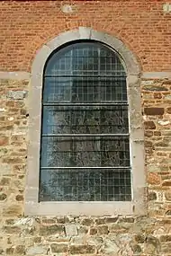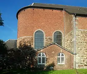 Le clocher est flanqué de chaque côté d'une annexe arrondie édifiée entièrement en moellons et percée d'un baie cintrée à encadrement de pierre bleue.