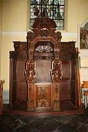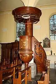 La nef abrite une chaire de vérité en chêne sculpté, adossée à une colonne.