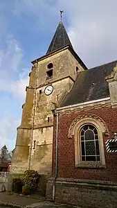 La tour-clocher, datée de 1752 avec un toit en forme de flèche, a subsisté après les combats de la Grande Guerre, il renferme deux cloches. L'église actuelle a été construite en brique. Elle ne comporte pas de transept et forme un vaisseau uniforme réunissant la nef et le chœur.