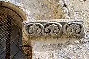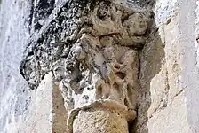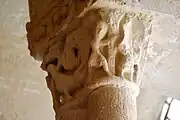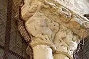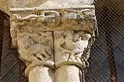Les deux corbeilles à deux faces et les tailloirs qui les abritent sont très dégradés par l'érosion et par les couches de badigeon.