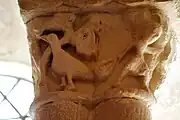 L'interprétation de ce chapiteau, qui met en parallèle le répertoire fablier médiéval et la concupiscence de la chair n'est pas évidente.