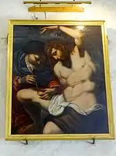 Parmi le mobilier de l'église, un seul élément est classé monument historique au titre objet, à savoir un tableau peint à l'huile sur toile, représentant saint Sébastien soigné par sainte Irène[17], qui lui retire les flèches de son martyre. Ce tableau mesure environ 150 cm de hauteur pour 100 cm de largeur à l'ouverture du cadre ; il a apparemment été réduit lors d'une restauration au XIXe siècle. Il a été peint à l'huile sur toile par un maître anonyme d'école bolonaise au XVIIe siècle (ou peut-être vénitienne ou florentine[18]), et est classé depuis novembre 1912[19]. Quelques autres éléments méritent aussi l'attention, mais la majeure partie du mobilier date du XIXe siècle, et n'a aucune originalité ; les statues et le chemin de croix notamment sont issus de fabrications en série et se trouvent dans bon nombre églises. L'on peut notamment citer la statuette de la Déesse Raison, déjà signalée ; un large bas-relief en pierre polychrome représentant la Cène, sur lequel on manque de renseignements ; un bas-relief provenant d'un retable démantelé et représentant la colombe du Saint-Esprit autour de rayons de lumière ; et deux autres tableaux, qui sont des copies de toiles de grands maîtres.