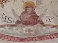 Dans cette représentation artistique, Jésus (= IHS) se tient au centre et au-dessus d’une croix à boules dont la signification reste à déterminer, de même que les autres éléments de cette peinture. Devant lui se tient la seconde fresque. À première vue, elle laisse transparaître la destination humaine. À gauche, en compagnie d'un être ailé et de l’église, à droite, en compagnie d’êtres inquiétants et d’un animal vorace.