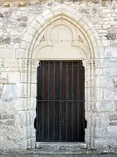 Qualifié de « charmant » par Dominique Vermand, le portail occidental est très simple, mais en même temps d'un style très raffiné. Il est flanqué de deux groupes de quatre fines colonnettes appareillées, dont la troisième, en comptant depuis l'extérieur, est plus grêle que les autres. Le diamètre des colonnettes correspond exactement aux tores de la double archivolte, et aux moulures du tympan. Celui-ci est assemblé de trois éléments, dont un seul pour toute la moitié inférieure. Il est seulement orné d'une tête trilobée, délimitée extérieurement par un petit et un plus grand tore : c'est ainsi que s'explique le diamètre réduit des troisièmes colonnettes. La tête trilobée est inscrite dans un arc en tiers-point, délimité par des tores du même diamètre, qui fusionnent avec les autres aux points de contact. Ainsi, deux écoinçons sont formés à gauche et à droite de la tête trilobée. Il n'y a pas de linteau, sa fonction étant assumée par le segment inférieur du tympan. Celui-ci repose sur deux corbeaux sculptés de motifs végétaux. Le portail est identique à celui de la chapelle de Tillard, dont l'on sait qu'elle date de 1342. Le style se rapproche, en outre, de celui de la fenêtre occidentale de Béthisy-Saint-Martin ; de la chapelle de la Vierge de Larchant ; et du portail latéral de Saint-Vivien de Rouen. Les chapiteaux fournissent des indices pour une datation plus précise. À gauche, les chapiteaux « présentent une superposition d'une rangée de feuillage naturaliste s'enroulant autour de la corbeille et de crochets qui suivent le mouvement de la corbeille, assez évasé. Du côté droit, au contraire, les deux derniers chapiteaux semblent n'être qu'une partie du fût de la colonnette, passant entre deux bagues l'astragale et le tailloir, sur laquelle s'enroule, en deux rangées régulières, des feuilles, sans doute de lierre » (Pierre-Jean Trombetta). Ces chapiteaux permettent de dire que le portail est postérieure à la chapelle de la Vierge de Larchant, et antérieure à la fenêtre occidentale de Béthisy-Saint-Martin, et à peu près contemporain du côté sud de la clôture du chœur de Notre-Dame de Paris, qui date de 1318. Avec la date de la chapelle de Tillard comme autre limite, la fourchette de la période comprise entre 1320 et 1340 est dès lors déterminée[5].