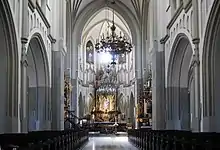 L'église a été construite en 1832 dans le style néo-classique. L'église était déjà trop petite à la fin du XIXe siècle, lorsque la communauté paroissiale comptait environ 17 000 fidèles. La décision fut prise en 1905 de la remplacer par une grande église. L'agrandissement a été dirigé de 1905 à 1909 par Jan Sas-Zubrzycki, qui a construit le bâtiment dans le style néo-gothique. Le bâtiment de l'église est un exemple du style Vistule-mer Baltique, la variante polonaise du néo-gothique, qui est liée au gothique en brique médiéval dans la région de la Vistule et de la mer Baltique. L'inspiration pour la tour ici était la tour nord de la basilique Sainte-Marie de Cracovie.