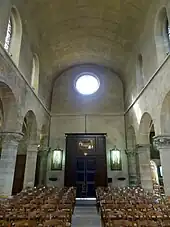 La nef communique avec les bas-côtés par quatre grandes arcades en plein cintre, non moulurées, et dont il n'est pas certain qu'elles ne résultent pas, dans leur forme actuelle, de la réfection de 1651 : les arcades brisées sont, en effet, répandues dès la fin de la période romane, depuis les années 1130, et règnent dans le chœur. En même temps, les arcades bouchées au nord des deux travées supprimées sont également en plein cintre. Les arcades retombent au centre sur les tailloirs de gros chapiteaux de piliers monocylindriques isolés, appareillés en tambour.