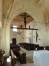 - La poutre de gloire à l'entrée du chœur est sculpté de pampres, et constitue sans doute la barre transversale qui délimitait supérieurement une ancienne clôture de chapelle. Les deux statuettes qui accompagnent le Christ en croix, beaucoup trop grand par rapport aux premiers, sont homogènes avec la poutre, tandis que le Christ est de toute évidence rapporté. La statuette de gauche pourrait représenter saint Jean avec le calice contenant le poison qui le remporta, mais il est possible que l'autre statuette tenait aussi un calice dans une main. Cette représentation n'est pas conforme à l'iconographie des poutres de gloire, où saint Jean a généralement les mains rejointes pour la prière, et le deuxième personnage devrait être la Vierge de douleur, et non un Apôtre ou saint.