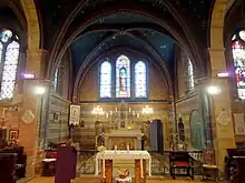 - les cinq vitraux purement ornementaux dans le style néo-gothique, que l'on trouve au chevet de la chapelle de la Vierge, dans les baies latérales du sanctuaire, et dans les baies de gauche et à droite du triplet du chevet ;