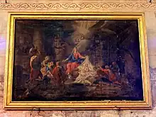 Parmi les autres tableaux, deux seulement sont mentionnés dans la monographie de l'abbé Vattier. Ils ont été peints en 1760 par un certain Dubourg, et représentent l'Adoration des bergers et le martyre de saint Sébastien (voir le chapitre Les dernières décennies de l'Ancien Régime). D'autres toiles remarquables sont la Nativité du Christ, Saint Joseph à l'Enfant, la Fuite en Égypte (copie d'après François Verdier), le baiser de Judas (copie d'après Francesco Gessi[24]), l´Ecce homo (copie de qualité, d'après Charles Le Brun), et la Descente de croix (copie faible d'après Laurent de La Hyre). Les renseignements sur la provenance, l'époque et les auteurs de ces œuvres manquent malheureusement.