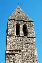 Le clocher est couronné d'une courte flèche pyramidale couverte de lauzes.