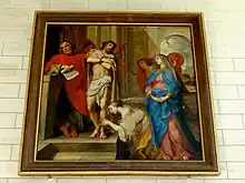 - Le tableau peint à l'huile sur toile accroché au-dessus du portail méridional illustre l'épisode de l'Ecce homo (Jn 19,5). La scène se situe sur le perron devant le palais de Ponce Pilate, que l'on voit tout à gauche, revêtu d'un manteau rouge. Dans sa main droite, il tient négligemment la pancarte Voici l'homme, et détourne le regard de Jésus, sur l'épaule duquel il pose son autre main. Jésus, les mains croisées et liées par une corde, est coiffée de la couronne d'épines, et vêtu seulement du périzonium et d'un lambeau d'un manteau. Il tient un roseau dans une main. À l'arrière-plan, un garde tient la corde. Le regard, presque impassible, est tourné vers sa mère, la Vierge, que l'on voit tout à droite. Son visage exprime la compassion et la tristesse. Derrière Marie, son ange protecteur, ébahi, lève les deux bras. En même temps, Marie-Madeleine, essuie les pieds du Christ avec sa propre chevelure, tout en fermant les yeux, d'une expression pleine d'amour. On ne voit pas la foule qui attend le jugement devant le palais. La rencontre avec les deux Maries évoque la neuvième station du Chemin de croix selon les Évangiles, tel que défini en 1991 par saint Jean-Paul II, quand Jésus rencontre des femmes de Jérusalem.